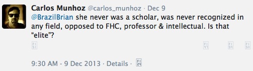 Resumindo, foi mais ou menos isso: devido a um artigo na Veja daquela semana, o Brian tuitou algo que colocava Dilma e FHC como membros da elite que chegaram à Presidência. Eu questionei quais os critérios dele para enquadrar Dilma como “elite”, ao que ele respondeu isso: