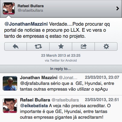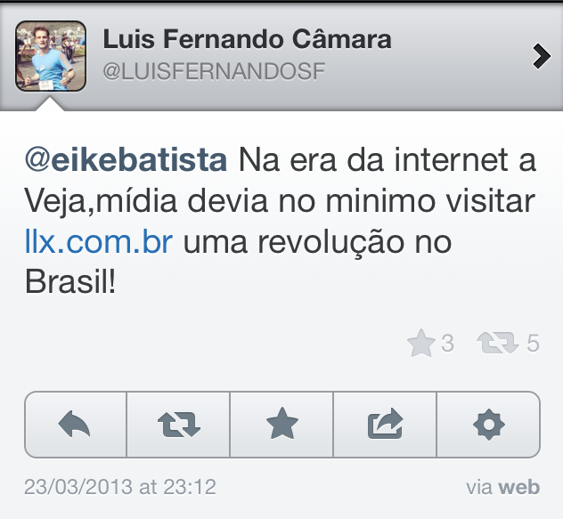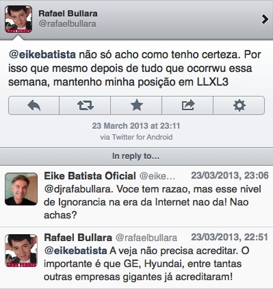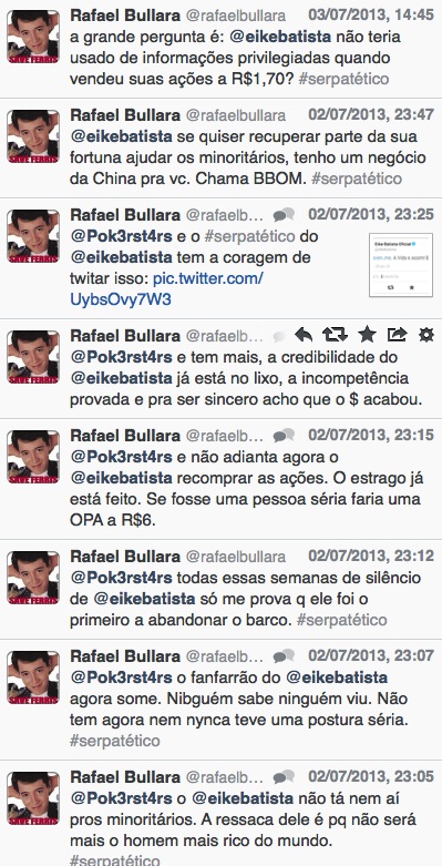 E o Rafael? Passou de admirador e defensor do Eike a acionista da LLX. Sua timeline do twitter indica uma, digamos, mudança de opinião sobre o Eike:
