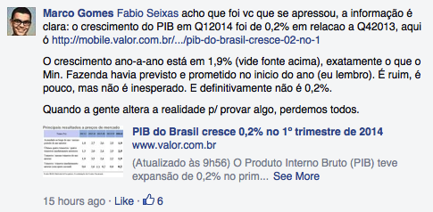Infelizmente, isso é cada vez mais o padrão. Não li, não sei o conteúdo, mas não me abstenho de comentar – nem que seja para falar besteira. E alguns sequer tentam disfarçar: assumem explicitamente que não leram, mas fizeram questão de comentar mesmo assim. Resta evidente que falar-se-á um amontoado de bobagens, como prova o Marco Gomes, quando diz que não faz sentido comparar o 2 trimestres seguidos de um indicador econômico.