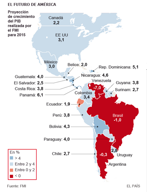 Não é coincidência, não: Argentina, Brasil e Venezuela são os únicos países das Américas que terão crescimento NEGATIVO em 2015. Há, nisto, uma combinação de ideologia burra (“bolivarianismo” ou qualquer porcaria equivalene) e incompetência (Chávez/Maduro, Lulla/Dilma e Cristina Kirchner).