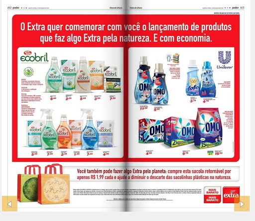 Esta aqui, do Hipermercado Extra, foi publicada na Folha de São Paulo em 22/07. Página dupla, central, no primeiro caderno da Folha: