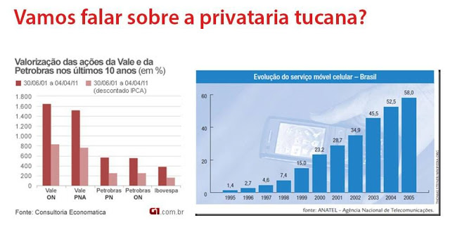 E já que mencionei outra empresa, vou expandir um pouquinho o escopo. Para quem quiser falar em “privataria tucana”, ou dizer que o PSDB algum dia quis privatizar a Petrobras (infelizmente jamais pretendeu, o que é uma pena), os gráficos abaixo podem magoar: uma sucinta comparação entre as ações da Vale, privatizada, e da Petrobras, estatal; há, ainda, um resumo do que houve com a telefonia celular graças à privatização (clique para ampliar):