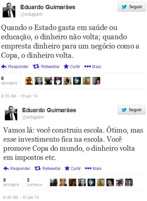 Dinheiro público, aliás, bem gasto: dá retorno em movimento de comércio, hotelaria, serviços, em turismo, em impostos. Dá lucro, enfim. Autoridades dos mais diversos partidos políticos sempre buscaram atuar na promoção de eventos. Por isso, por reconhecer que o investimento de dinheiro público em eventos é de interesse geral, os meios de comunicação jamais o questionaram. Por que, se o evento é a abertura da Copa do Mundo, passa a ser ruim?