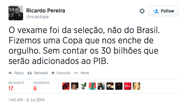 E é justamente neste quesito que os investimentos Bilionários na Copa do Mundo deveriam ser mais criteriosamente analisados. Não estão sendo. O retorno a ser gerado pela Copa do Mundo tem sido superdimensionado, tudo no afã de justificar investimentos altíssimos.