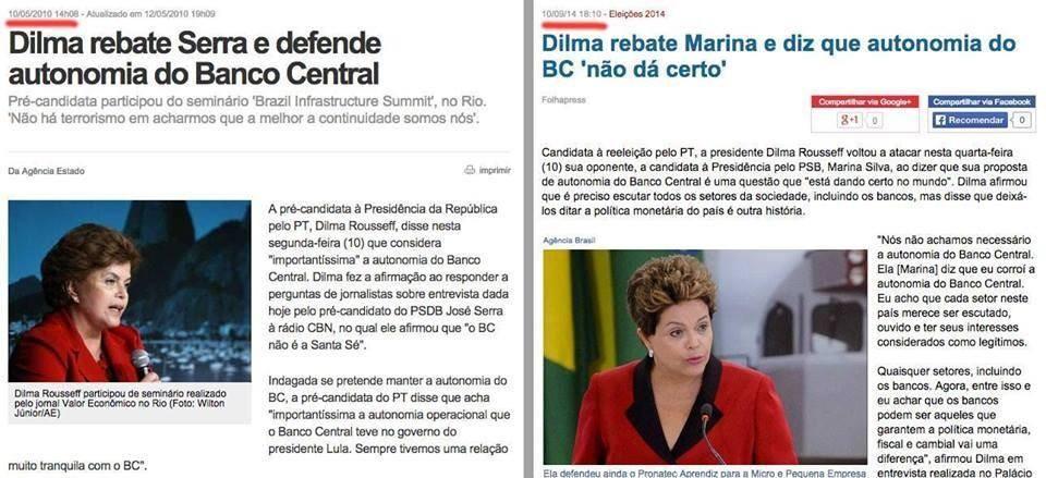 Uma coisa é um(a) candidato(a) dizer coisas diferentes em momentos diferentes – vejamos, por exemplo, Dilma Rousseff, que em 2010 era favorável à autonomia do Banco Central, mas em 2014 está produzindo mentiras sobre o assunto em virtude da posição da Marina Silva: